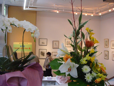 My art class is now calling itself the "Izumi Art Club" and we are having an art show in a gallery in the center of Sendai. We are each taking turns staying at the show to answer questions and that sort of thing. My turn was yesterday and I have to go again today. This first picture shows a woman looking at my pictures (the two on each side of her). The flowers were sent by some art group. It is traditional in Japan to send flowers for almost any public event. The flowers are used to decorate the locale. I think that it is a very nice tradition.